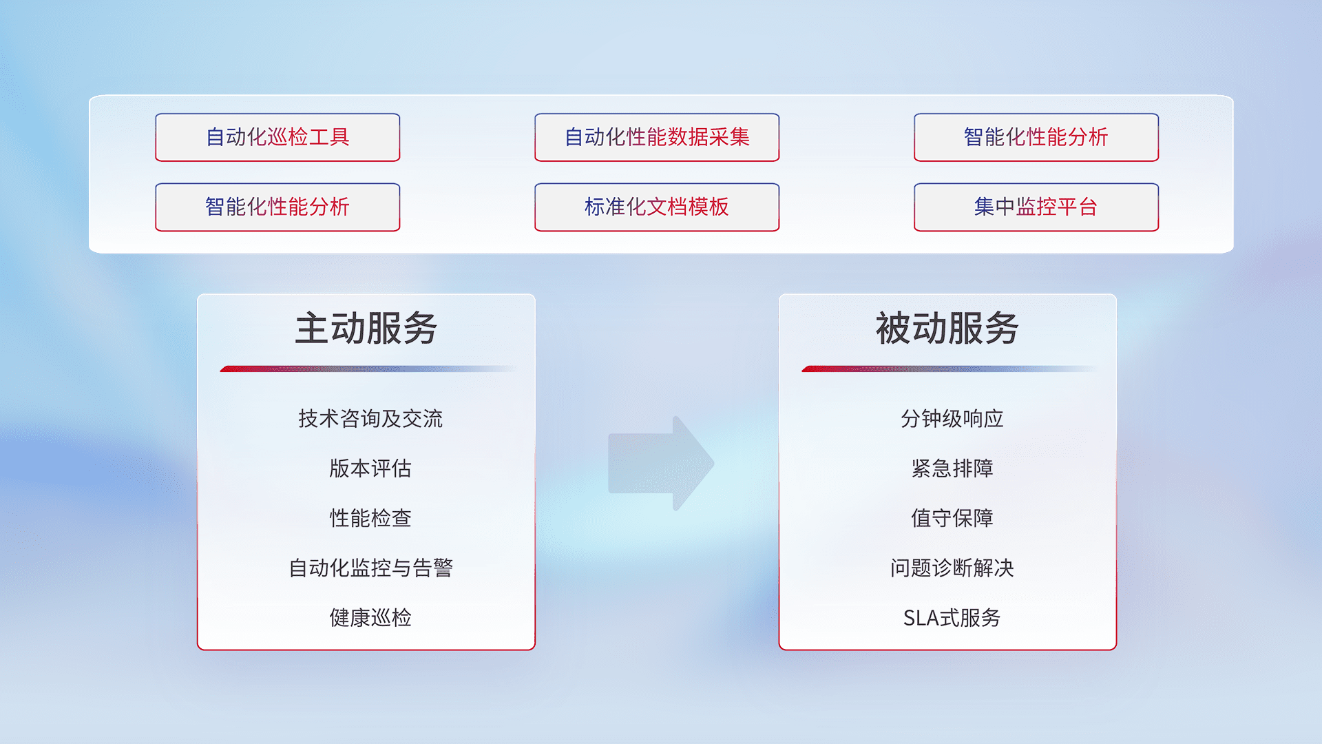 智能化工具和标准化文档,,保障服务质量,,,,提供主动服务(包含技术咨询、、版本评估、、、、性能检查、、自动化监控与告警、、健康巡检)和被动服务包含(分钟级响应、、紧急排障、、值守保障、、问题诊断解决、、SLA服务)。。。